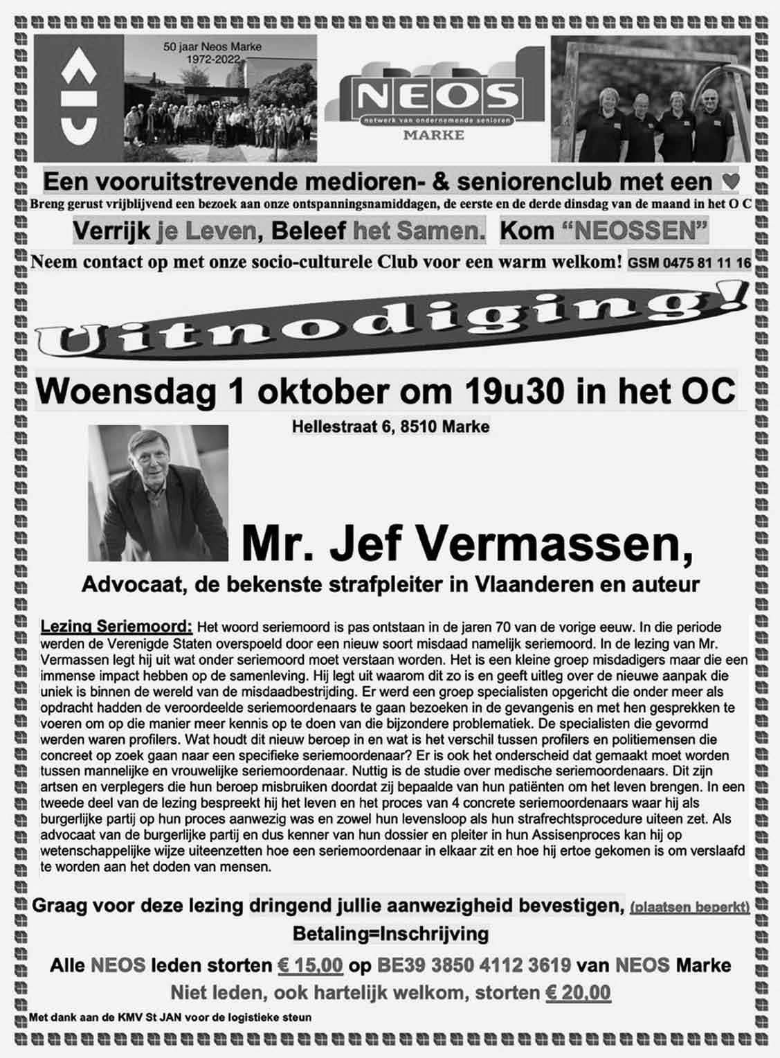 - Lezing Mr. Jef Vermassen “seriemoord": woensdag 1 oktober om 19u30 in het OC