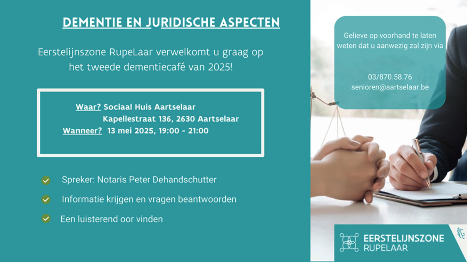 Volg zeker ook de andere samenkomsten in onze Rupelstreek voor dit jaar via eerstelijnszone.be/dementiecafes-eerstelijnszone-rupelaar-2025
