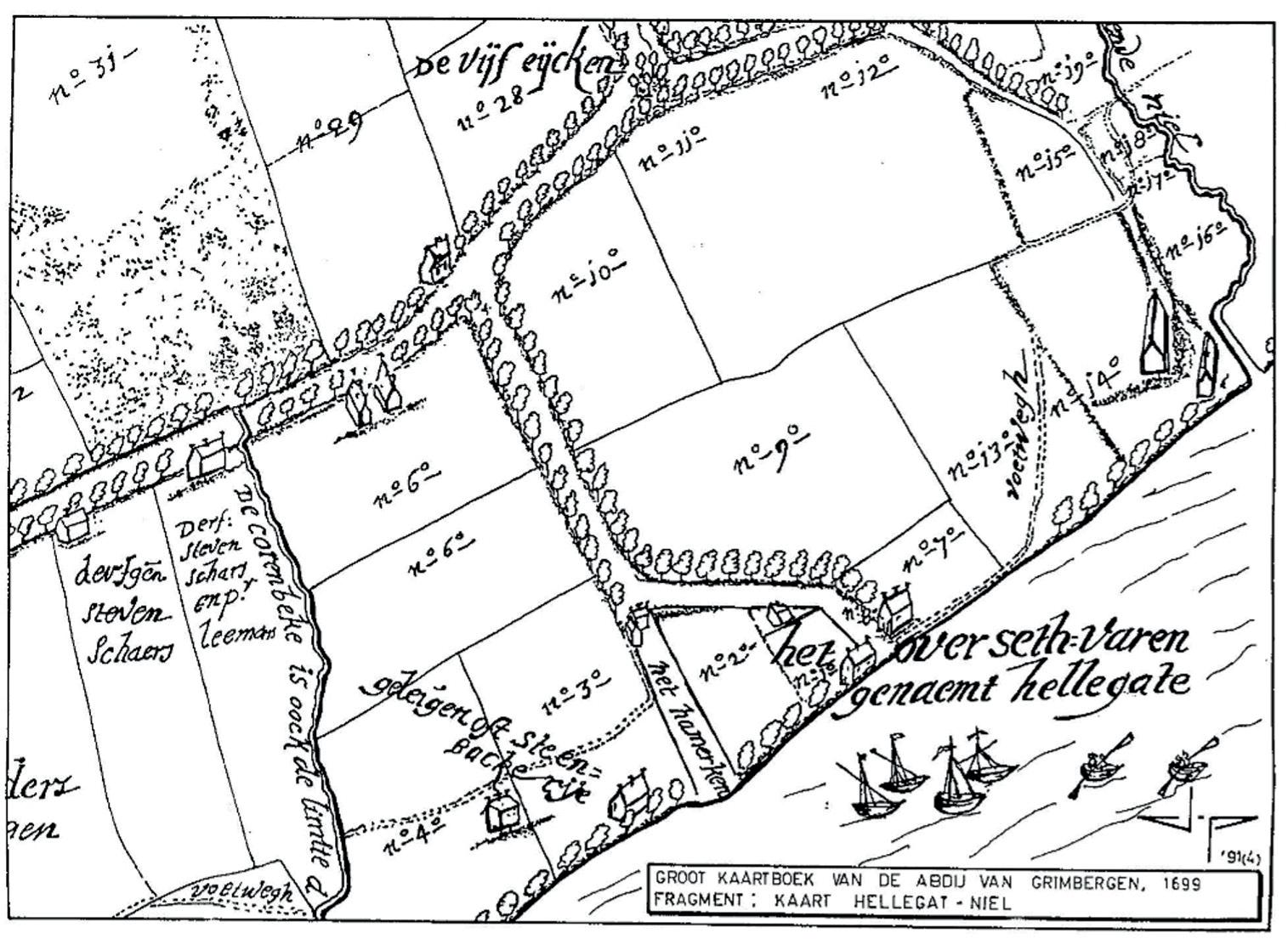 Perceel nr 31, blijkt in 1699 nog een bos. De “Corenbeke” (onderaan links) dwarst hier de huidige Boomsestraat en loopt normaal gezien verder door het hoger gelegen bos.