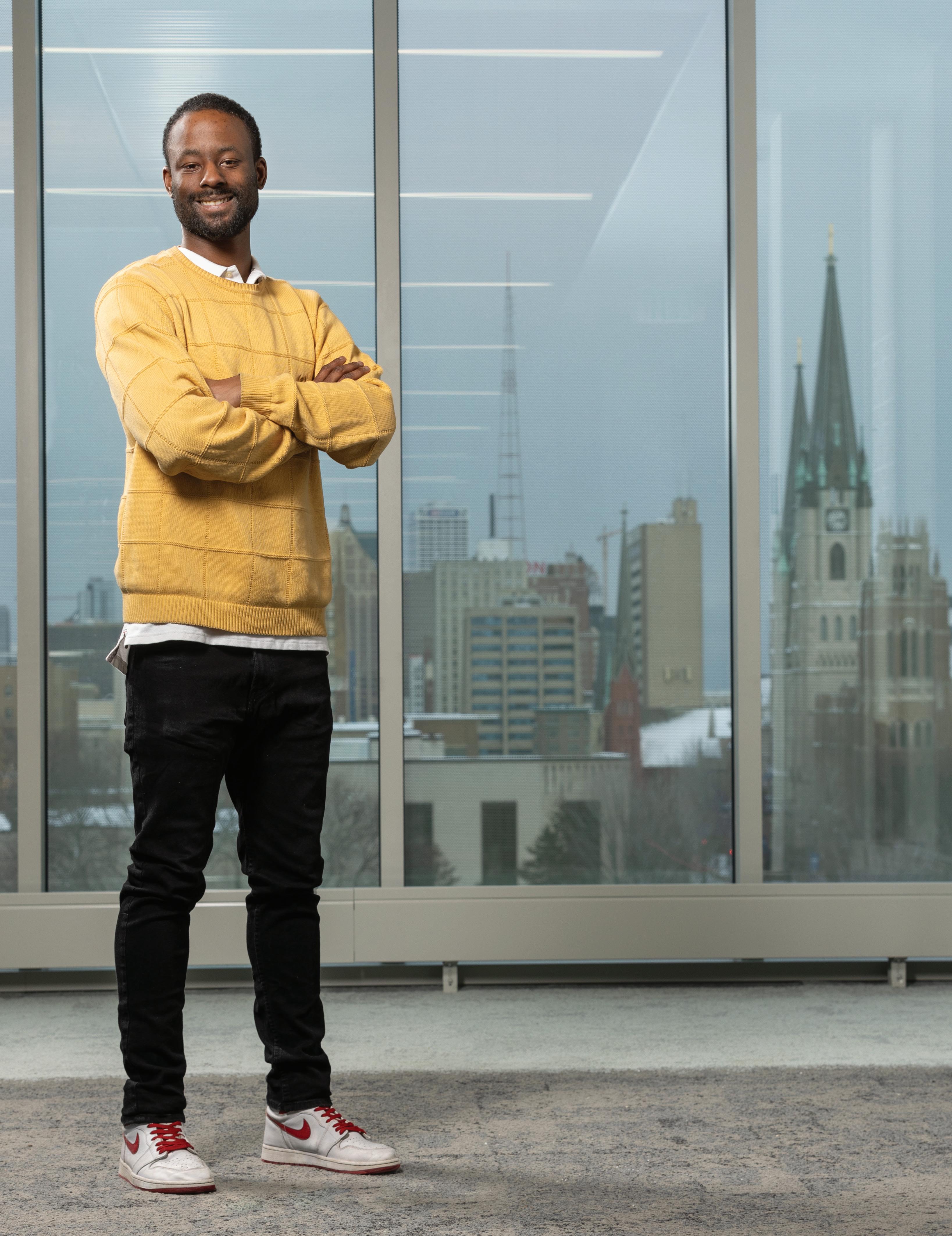 Featured in the Spring ’22 issue, MATC alumnus David J. Perez III stands with his sculpture “Wet Paint Chango’s Perseverance.” The artwork was installed at the Downtown Milwaukee Campus in June 2023.