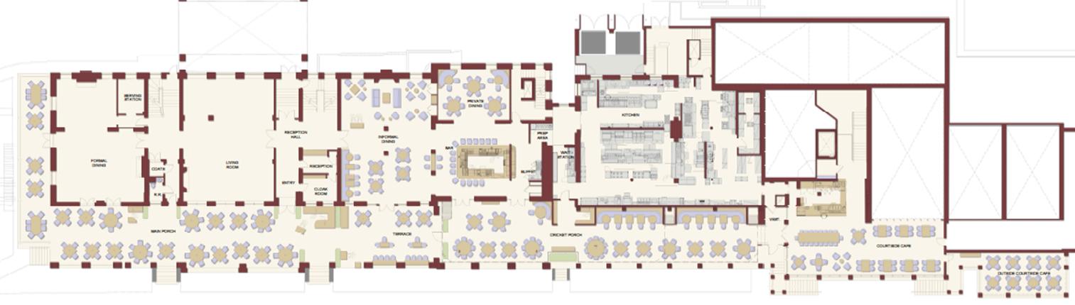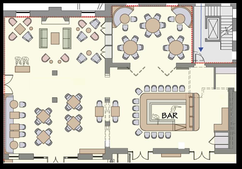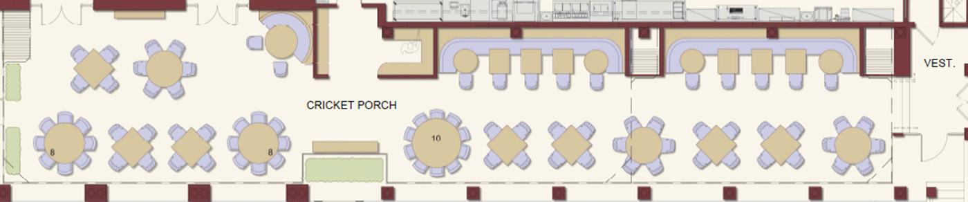 The Cricket Room booths are underutilized due to limited visual appeal and comfort, resulting in inefficient use of space. A revised layout with banquette seating, consistent with the current Cricket Bar design, would improve spatial efficiency and visual cohesion.