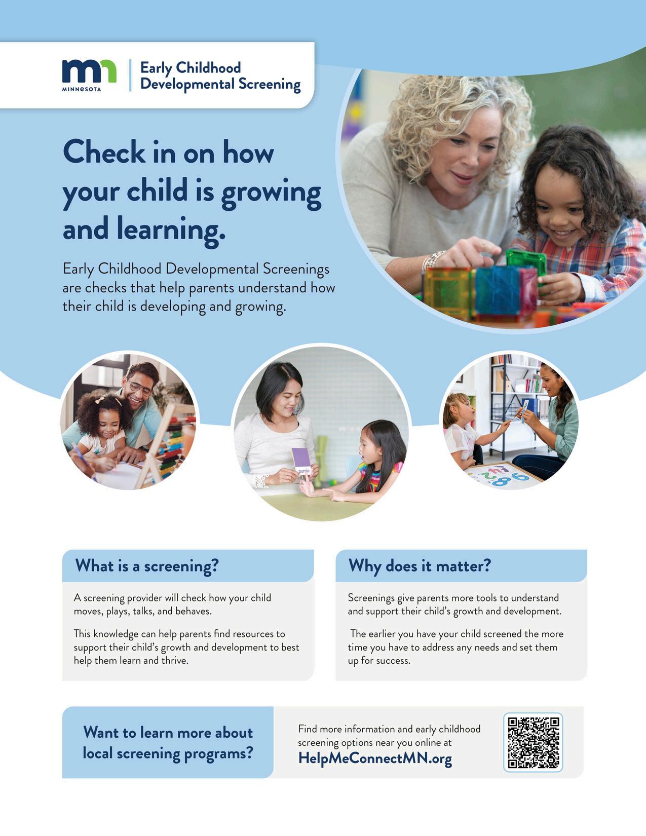 Help Me Grow provides resources for families to look at development milestones, to learn if there are concerns, and to take the lead in seeking additional support or in referring their child for a comprehensive, confidential screening or evaluation at no cost Minnesota children from birth to 5 years, if found eligible, can receive services in their home, child care setting or school These services are free regardless of income or immigrant status