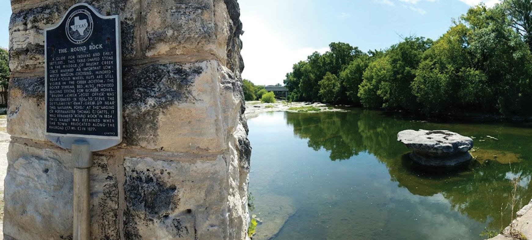 Modern Round Rock’s roots lie several miles from downtown along the banks of Brushy Creek. The thriving community started like many other Texas communities: cattle driving, followed by becoming a transportation hub. The hamlet, originally named Brushy Creek, was located at a natural crossing point in the river used by cattle drivers on their way to Kansas. Its unique feature was an anvil-shaped boulder in the river, which passers-by called the “round rock.” This famous rock can be seen in the middle of Brushy Creek near Chisholm Trail Street.
