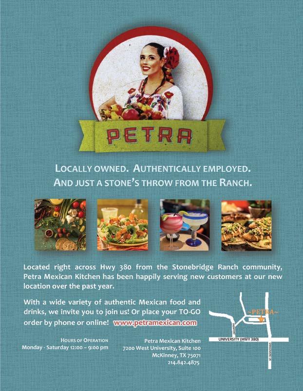 24 stonebridgeranch.com 218 E. LOUISIANA STREET, STE. 300 MCKINNEY, TX 75069 (214) 548-4075 URBANGRILLMCKINNEY.COM A UNIQUE, UPSCALE EATERY IN HISTORIC DOWNTOWN Monday: 4pm-9pm Tuesday-Thursday: 11am-9pm Friday: 11am-10pm Saturday: 10am-10pm Sunday: 10am-9pm E VERY DAY VALUE PRICES! DRIVE THRU • 24-HR. DROP OFF BOX • ALTERATIONS • LEATHER DRY CLEAN SUPER CENTER CleaningALLDry& DoneLaundry Premiseson SAME DAY SERVICE M-Finby9outby5 Satinby9outby4 HOURS M-F: 6:30am-7pm Sat: 7am-6pm Since 1997 3601 Eldorado Pkwy. just west of Hardin next to Kwik Kar 972.540.1888 $ 1 59 $ 2 69 $ 3 99 DRESSES Starting at Men’s Shirts Laundered Most Garments Dry Cleaned including shirts, blouses, golf shirts, etc. COMFORTERS Starting at