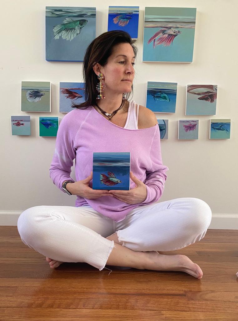 Penelope El-Dalati: I started painting goldfish for my thesis in the School of Visual Arts. I thoroughly enjoyed creating them and the incredibly quiet space it made around me. I have had people tell me they don’t see a goldfish, but rather something else or some have said they all look abstract to their eye. It’s wonderful to see how viewers interpret the work. I have been dubbed “The Goldfish Artist of the Jersey Shore” as I have been painting goldfish for 25 years.
