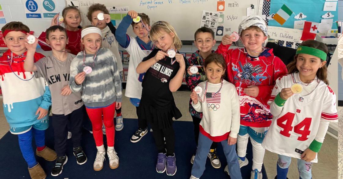 Monmouth Beach School students researched Olympic events, created medals and torches, and cheered on Team USA during the Winter Olympics. Students learned about the history of the Games and explored the symbols behind the competition. Teachers also got into the spirit by donning ancient Greek outfits.
