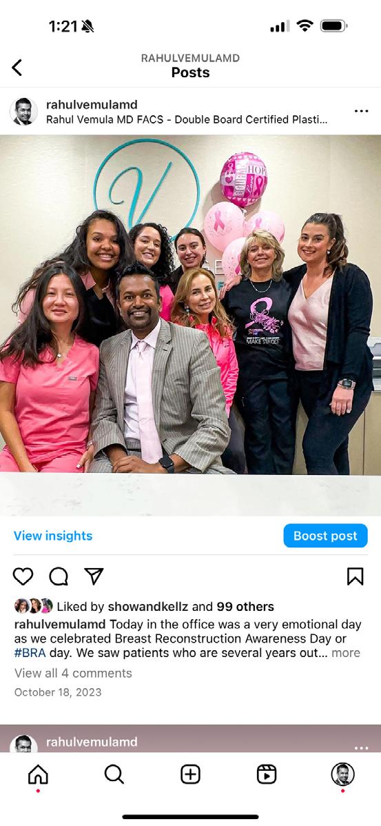 “I can not thank Dr Vemula and his staff enough During the darkest time of my life, they have been the shining light The professionalism, caring, and genuine support they have shown me has been amazing From the smiles I am greeted with walking into the office to the gentle touch of concern, the open and honest conversations and thorough education about reconstruction I received is beyond measure He is a true artist and I now feel like a woman again The results from my surgeries are phenomenal!!! “ -verified patient review