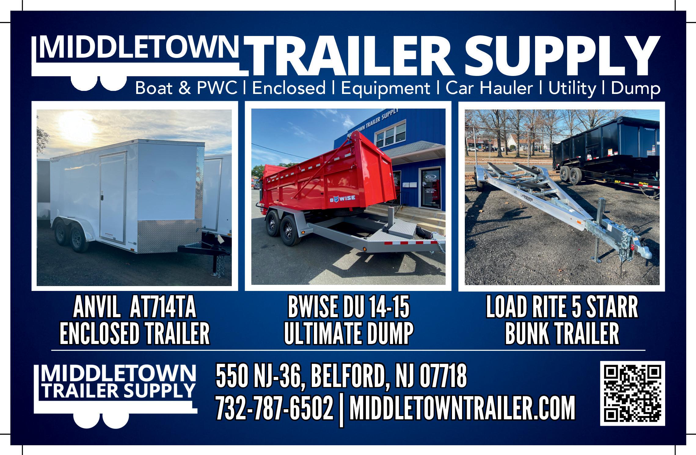 With over 200 trailers on site, options for customizable colors and sizes, expert repair department, and a team that treats you like family, it is no wonder Middletown Trailer Supply has become a staple in the community. Visit them at 550 Route 36 in Belford, New Jersey and get your new trailer today.