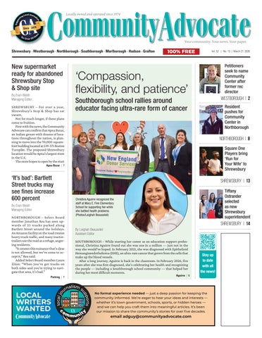 The Community Advocate’s Policy on Letters to the Editor Letters must be signed with a name, address and telephone number for verification (only name and town will be printed). Letters should be sent to news@communityadvocate.com or mailed to Managing Editor c/o Community Advocate, 32 South St. Westborough MA 01581. The editor reserves the right to reject letters on the basis of length, libelous content, suitability and space constraints. Multiple letters from the same person will not be accepted within a 30-day period. “Form letter” submissions, in which the content of one letter is essentially duplicated, will not be accepted. Letters should be 350 words or less. Deadline is 12 p.m. Friday the week before publication. Opinions expressed in the letters to the editor do not necessarily represent the opinion of the Community Advocate management or its advertisers.