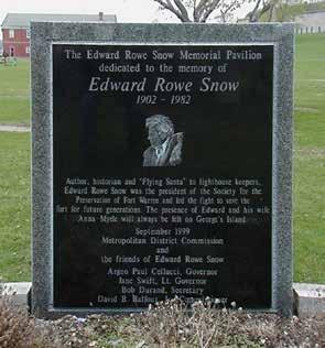 Edward Rowe Snow, the Flying Santa of New England lighthouse keepers, is remembered with this memorial plaque on Georges Island in Boston Harbor.