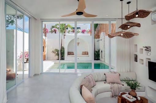 mansion, inspired by the crisp, whitewashed feel of Santorini. The open-air design featured pristine white walls, complemented by an aquamarine Mediterranean-style in-villa pool that was all ours. A cosmopolitan layout, with furnishings and artwork chosen to enhance the serene and inviting atmosphere.