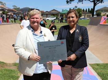 Blacktown City Deputy Mayor Julie Griffiths and Councillor Kushpinder Kaur at the grand opening of Alwyn Lindfield Skate Park in Glenwood.
