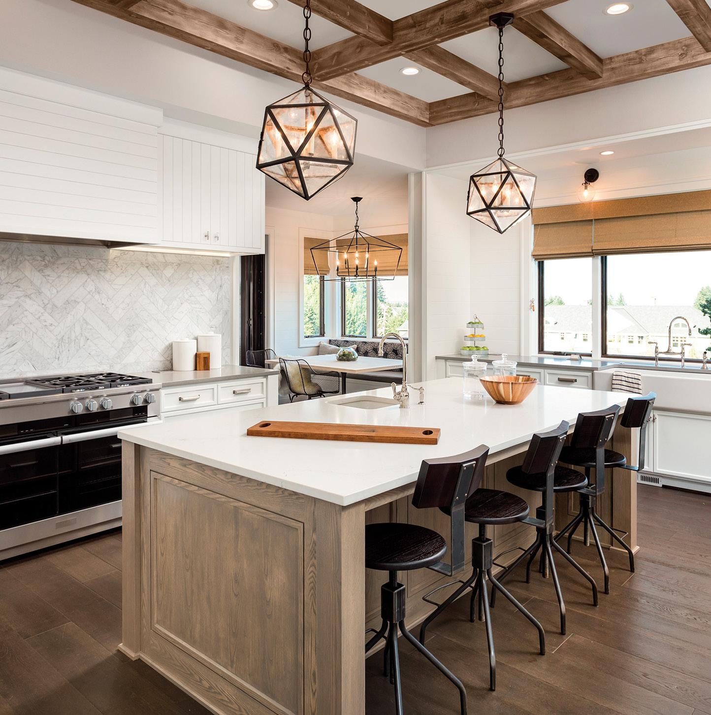 A design feature all their own, lighting fixtures like chandeliers or pendants over the kitchen table or center island can instantly elevate your kitchen’s look and feel. For a sleek, modern aesthetic, consider polished chrome finishes; think brass or brushed nickel for warmth; or opt for matte black for stunning contrast. Remember to look for fixtures in finishes that complement your appliances and cabinet hardware to truly bring the space together.