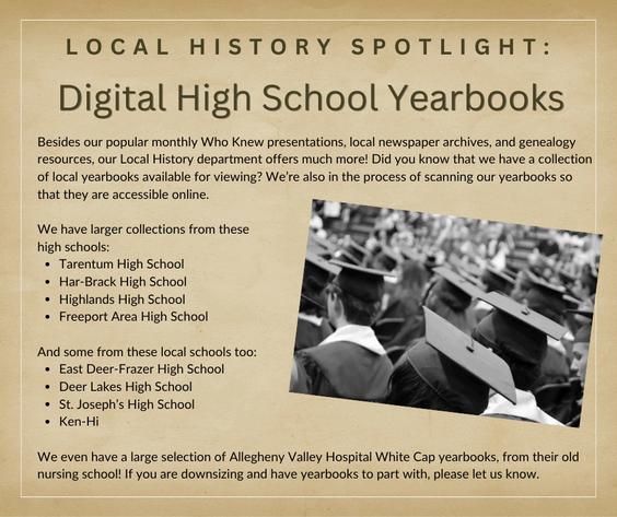Collection includes Tarentum High School, Saint Joseph School, Harrison Homestead, Y.M.C.A. (Tarentum), Community Library of Allegheny Valley, First United Presbyterian Church, Saint Joseph Catholic Church, The Chapman Building, and Allegheny Valley Hospital. (Not available: Tarentum Train Station, Har-Brack Union High School, the Manos Theater )