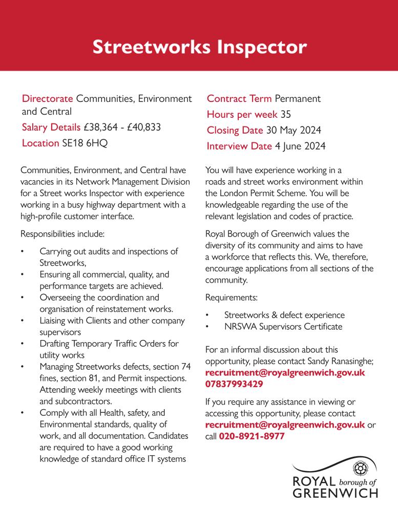 7. Queries concerning these works should be directed to the Royal Borough of Greenwich’s Directorate of Regeneration, Enterprise & Skills on 020 8921 6340. Ryan Nibbs Assistant Director, Transport. The Woolwich Centre, 35 Wellington Street, SE18 6HQ Dated 03 April 2024
