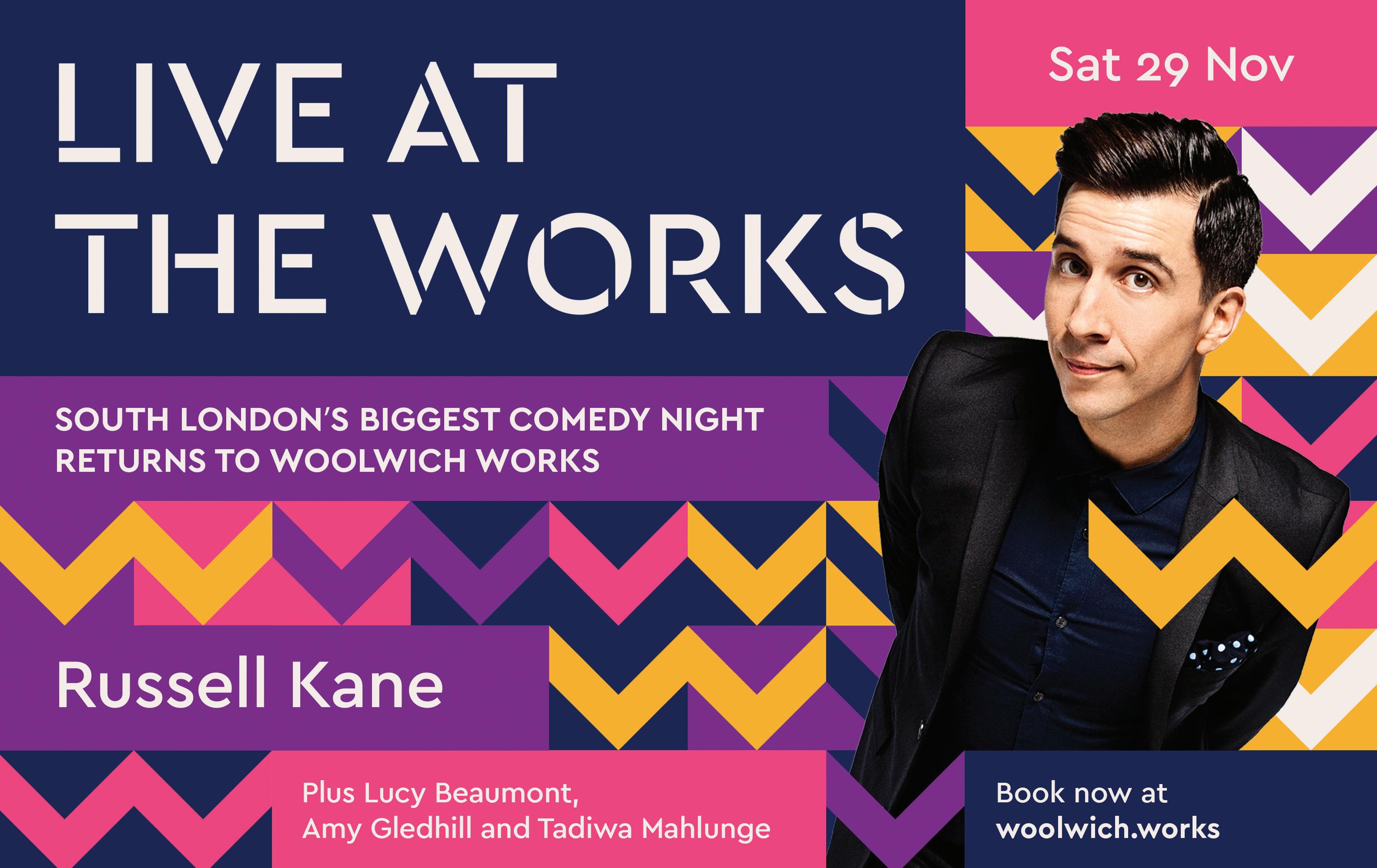 Award-winning comedian Russell Kane will be taking centre stage at Woolwich Works this November for a return of fan-favourite comedy night, Live at the Works, writes Evie Flynn...