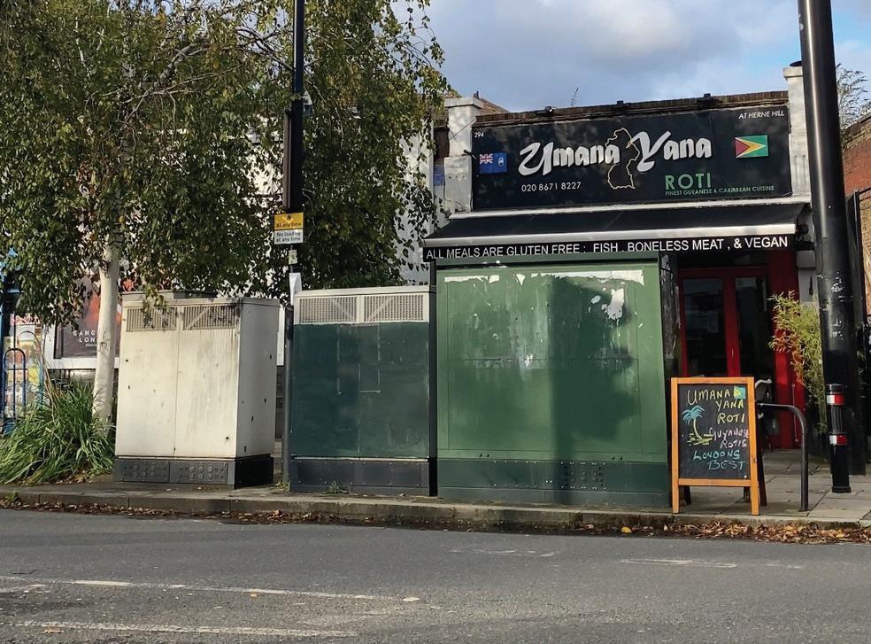 Umana Yana, a Guyanese restaurant on Croxted Road, has been in the shadow of the boxes since 2012, which completely block the view of the restaurant from the street.