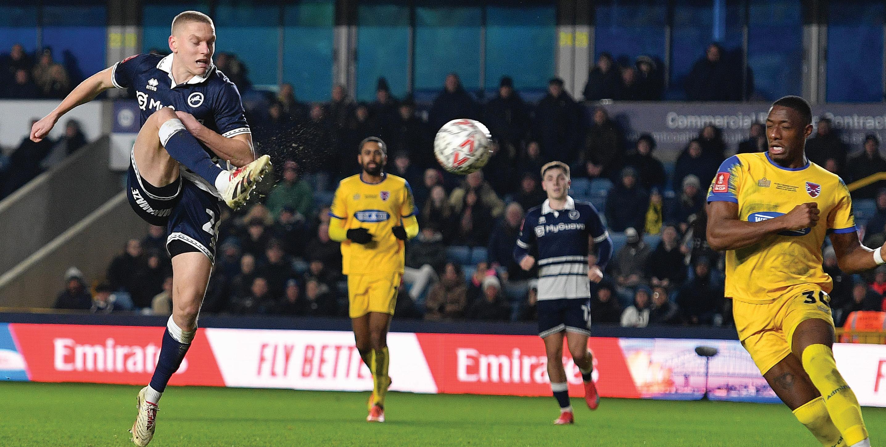 Casper De Norre scores Millwall’s second goal during their 3-0 win against Dagenham & Redbridge