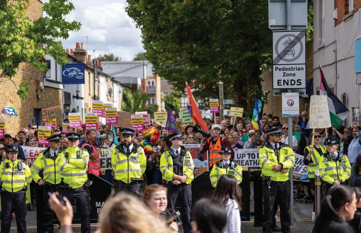 are welcome here” rang out from the antifascist side, answered by flag supporters who replaced “refugees” with “British flags”. Although the protest was mostly peaceful, Tommy told the LDRS that one marcher allegedly tried to snatch a sign from an antifascist demonstrator. “It was a bit worrying,” he said.