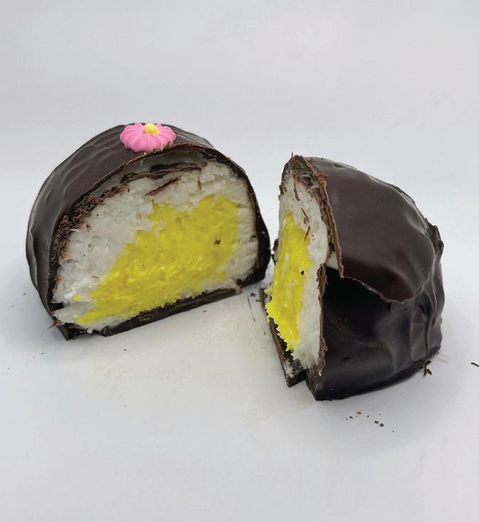 For those not fortunate enough to be familiar, picture a Cadbury Creme Egg that weighs one pound, with coconut cream in place of the mere sugary goo that Cadbury offers. And at the center, in one of the confectionery industry’s most closely guarded secret, that yellow faux yolk center.