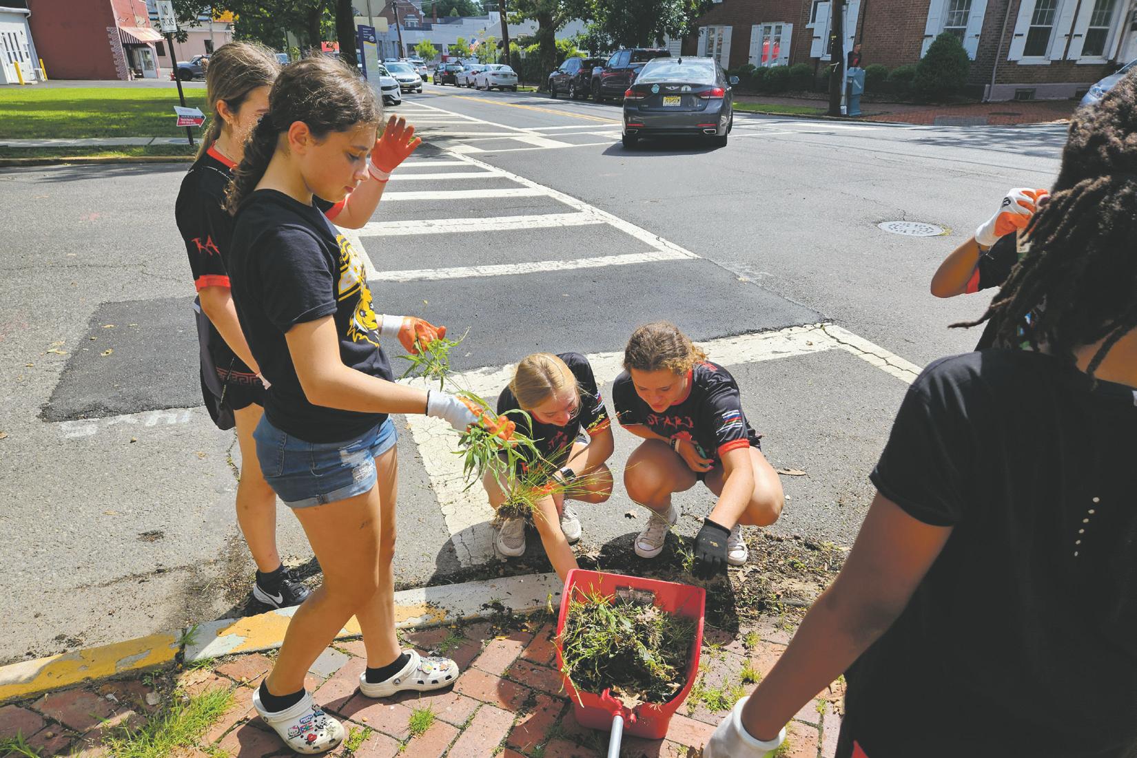 Spartan Bootcamp members Jackie Katz, Sami Brown, Taryn Mager and Kaylee Campos of Bordentown weeding on Farnsworth Avenue on July 29, 2023 as part of a citywide cleanup effort.