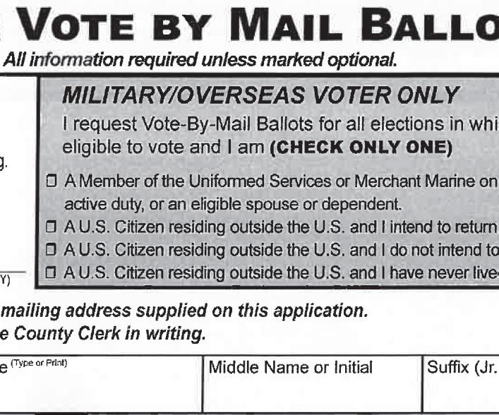 • You must complete the application form below and send it to the county clerk where you reside or write or apply in person to the county clerk where you reside to request a mail-in ballot.