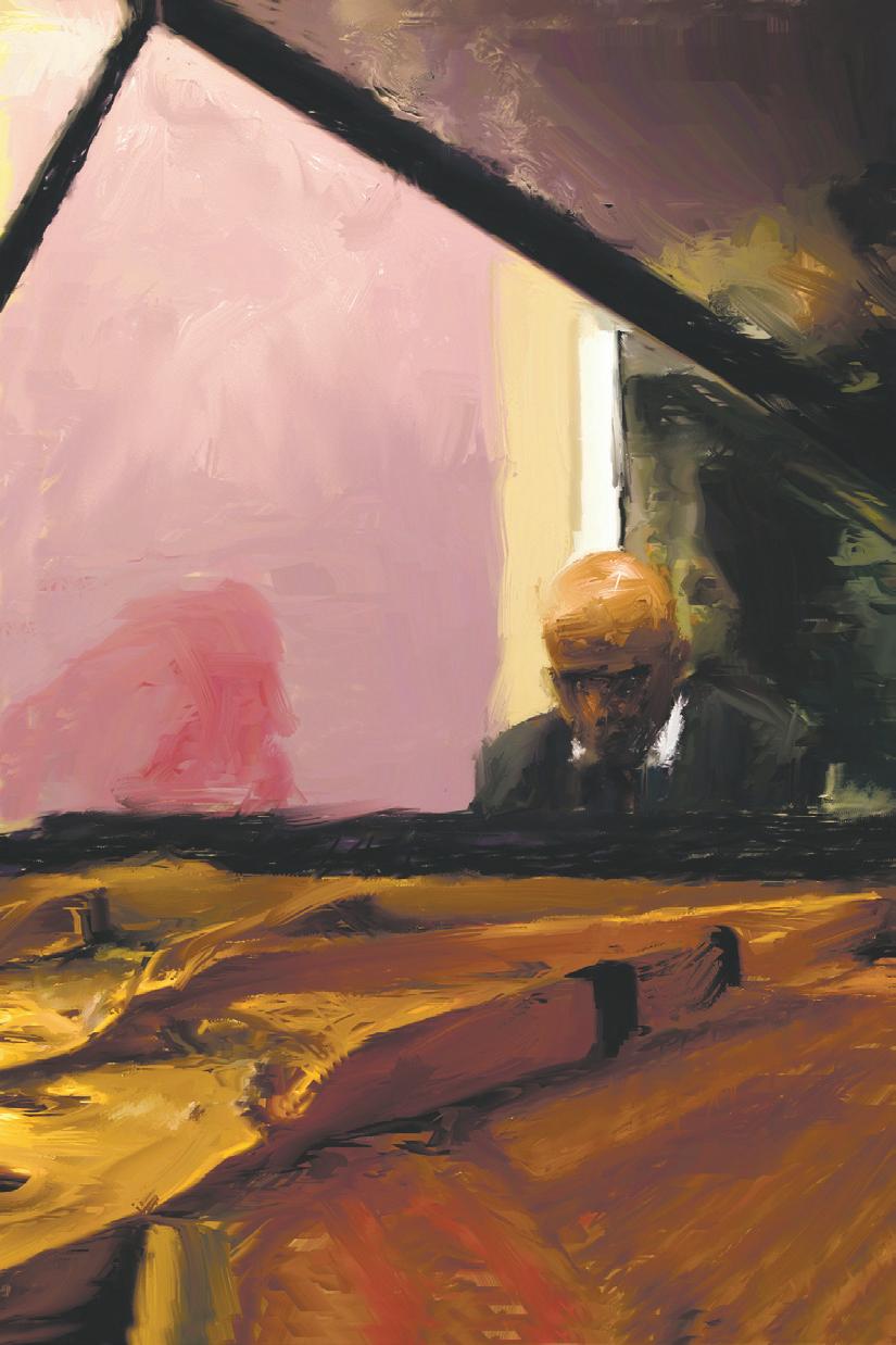 favorite painters include Edward Hopper, John Sloan, and landscape painters of the 1800s. Other artists whose work is important to him include Vermeer and, at an opposite end of the spectrum, Rothko. In recent years, he has given more thought to what his paintings are “about” on a personal, philosophical level. Many of his titles refer to a particular moment in time, like “Sunday Evening” or “Friday Night, Lafayette Street,” and brings attention to the mood and the meaning of that moment: perhaps a quiet evening at home, or a time shared with a community of friends. “Experiencing that moment makes me think of the different things going on in a scene; and if there are several people in a painting, what are the stories each of them has.”