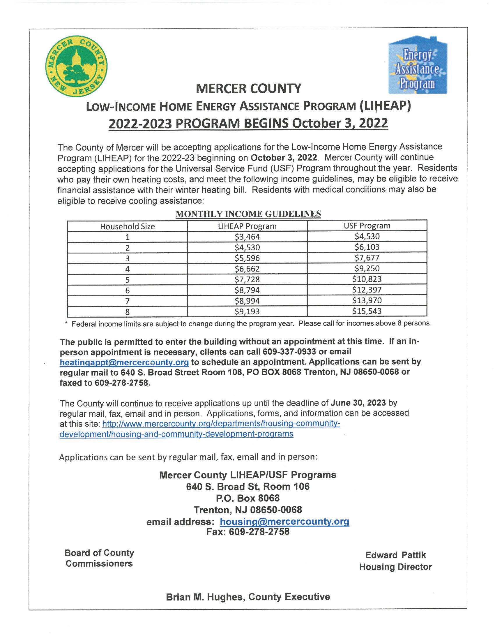 The County of Mercer will be accepting applications for the Low-Income Home Energy Assistance Program (LIHEAP) for the 2024-2025 beginning October 1, 2024. Mercer County will continue accepting applications for the Universal Service Fund (USF) Program throughout the year. Residents who pay their own heating costs, and meet the following income guidelines, may be eligible to receive financial assistance with their winter heating bill. Residents with medical conditions may also be eligible to receive cooling assistance: