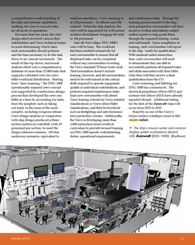 a comprehensive understanding of the ship and systems capabilities enabling the crew to execute tasks for all facets of operations. For more than ten years, the crew design effort involved various fleet stakeholders and Navy technical teams focused determining which tasks each crewmember should perform and the time necessary to do the task, down to six-minute increments. The result of this top-down, functionalanalysis effort was a comprehensive database of more than 25,000 tasks that supports a detailed view for crew/ billet workload distribution. Starting from “zero-manning,” the DDG 1000 operationally manned crew concept was supported by a meticulous design process that developed the crew one billet at a time by accounting for tasks from the simplest, such as taking out trash, to the some of the most complex, including weapons release. Crew design analysis in conjunction with ship design produced a threesection underway watchbill, with 19 personnel per section, to meet the design reference-mission: 120-day underway scenarios, equivalent to