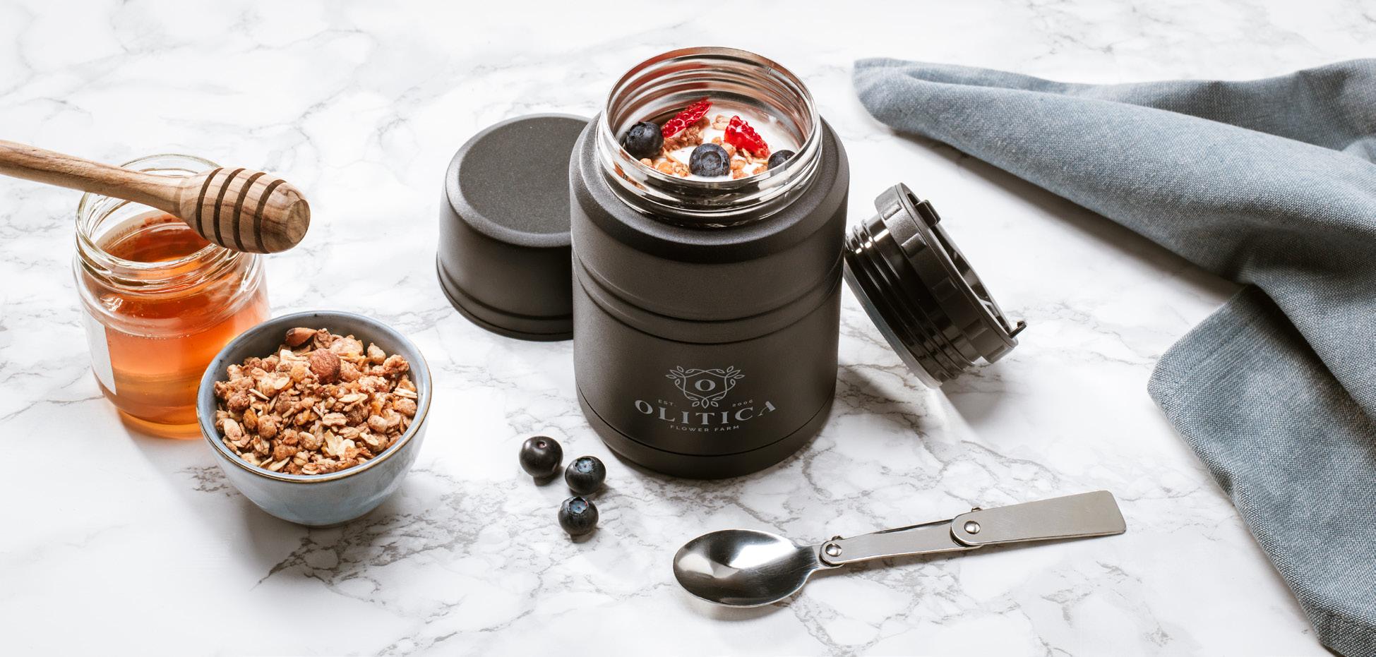 Doppelwandiger, vakuumisolierter Lebensmittelbehälter aus Edelstahl. Dieser schicke und nachhaltige Behälter hält Lebensmittel den ganzen Tag frisch und bis zu 6 Stunden lang warm • exzellente Qualität • BPA-frei • metallic-Lackierung • gummierter Griff • rutschfester Boden • spülmaschinenfester Schraubverschluss mit Ventil zum Abblasen von Dampf und zur Druckreduzierung • 100% auslaufsicher. Geeignet für die Mitnahme von einem Lunch, einer warmen Mahlzeit oder einen gesunden Snack. Fassungsvermögen: 400 ml. Maße: Ø 10 x 9 cm. 327 g.
