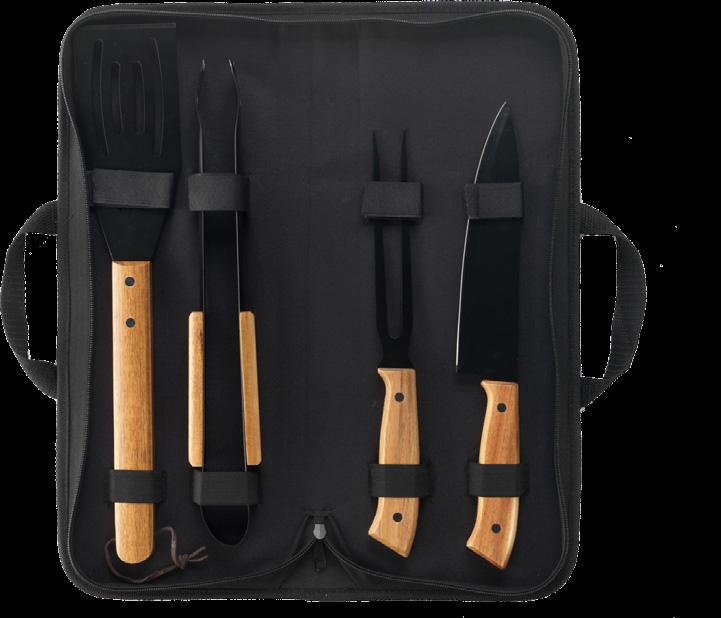 4-teiliges Barbecue-Set: Spatel, Gabel, Messer und Fleischzange. Der Edelstahl hat eine schöne schwarze Beschichtung und die Accessoires haben Griffe aus Akazienholz. Dieses schicke Set wird in einer 600D Nylontasche geliefert. Maße: 44 x 16 x 6 cm. 840 g.