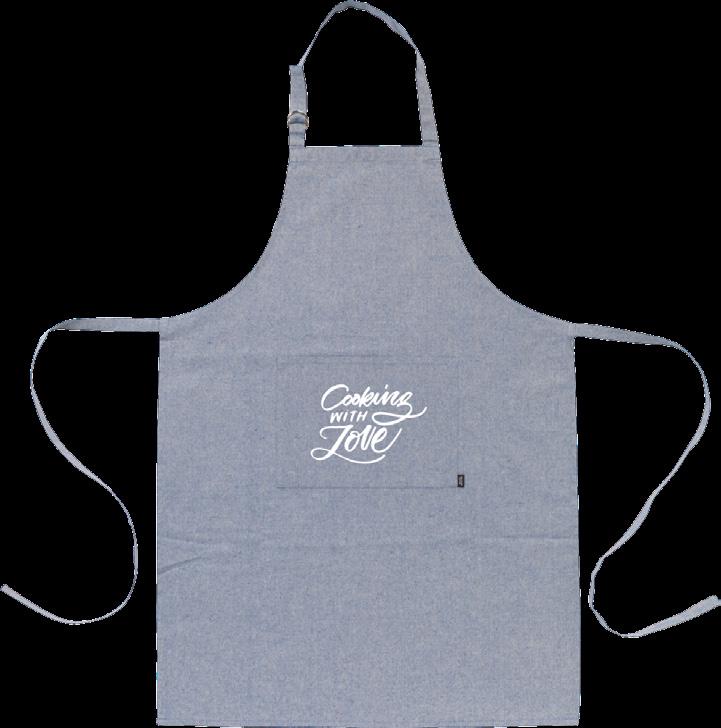 Öko-Schürze aus gemischter, recycelter Baumwolle (160 g/ m²). Mit aufgesetzter Tasche. Das Umhängeband kann mit einer Metallschnalle eingestellt werden. Langlebig und umweltfreundlich. Maße: 90 x 65 cm. 140 g.