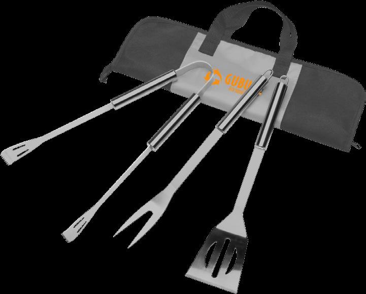 3-teiliges Barbecueset aus Edelstahl: Pfannenwender, Gabel und Fleischzange. In einem Vliesetui mit extra Einsteckfach aus Nylon auf der Vorderseite. Maße: 40,5 x 12 x 4,5 cm. 475 g.