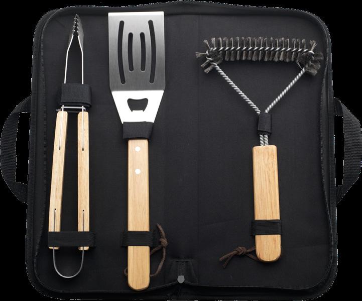 3-teiliges Barbecue-Set bestehend aus: Spatel, Grillzange und Edelstahlbürste zur Pflege des Grills. Die Accessoires sind mit Griffen aus Gummibaum-Holz versehen. Dieses funktionelle Set wird in einer 600D Nylontasche geliefert. Maße: 42,5 x 19 x 5,2 cm. 860 g.