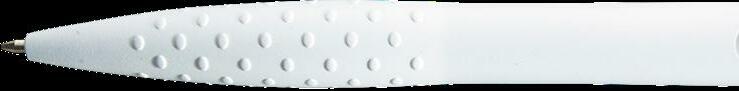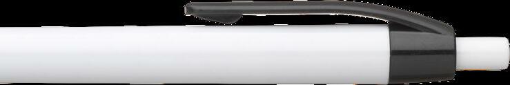 Blauschreibender oder schwarzschreibender Kugelschreiber mit weißem Gehäuse, farbigem, grifffestem Vorderstück und Metallclip. Bitte geben Sie bei Ihrer Bestellung Ihre Wahl an. Maße: Ø 1,1 x 14,1 cm. 10 g.