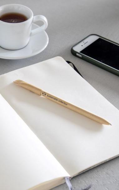 Umweltfreundlicher Kugelschreiber mit Halter aus Recyclingpapier. Der Clip, der Druckknopf und die Spitze bestehen aus biologisch abbaubarem PLA. Mit blauer Tinte. Maße: Ø 1 x 14 cm. 6 g.