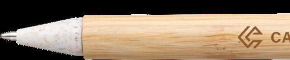 Blauschreibender Kugelschreiber mit Bambusgehäuse. Der Clip, der Druckknopf und die Spitze sind hergestellt aus Weizenstroh/ PP-Kunststoff. Fast vollständig abbaubar. Eine umweltbewusste Wahl. Maße: Ø 1,1 x 13,5 cm. 6,5 g.