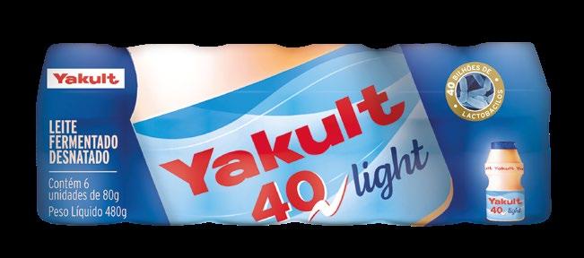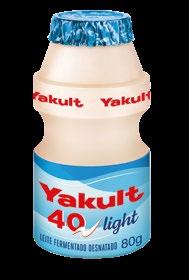 to com vida agitada ou idade avançada, enquanto o Yakult 40 light agrada especialmente o consumidor que leva uma vida moderna e se preocupa com o menor consumo de calorias – uma vez que tem apenas 30 calorias por frasco de 80 gramas. Ambos possuem 40 bilhões de Lactobacillus casei Shirota por frasco.