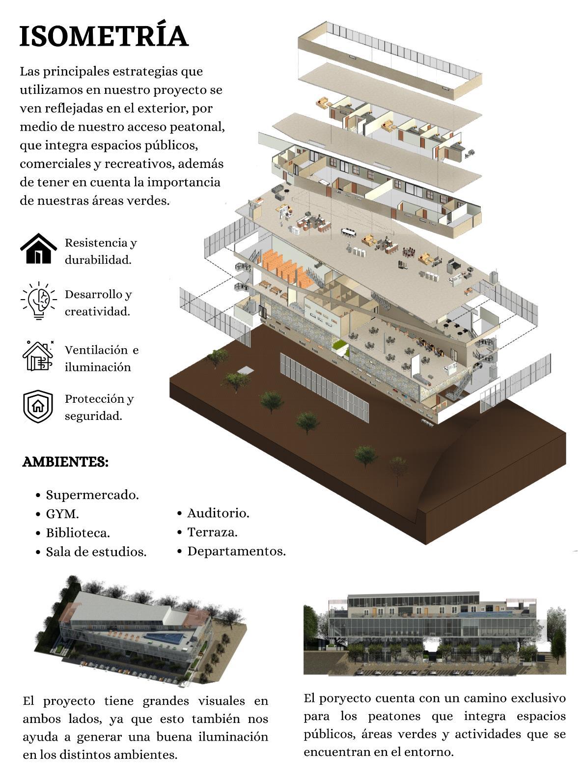Pór elló reálizámós este edificio que tiene como función satisfacer algunas de las necesidades que tienen las personas de Chachapoyas. Para lograr un buen resultado se tomó en cuenta un análisis, que se fue haciendo desde lo más macro hasta lo más micro, en el cuál analizamos el lugar en donde reálizámós dicho proyecto, ádemás estudiamós su entorno, el usuario y todo lo que nos ayudaría a realizar una buena propuesta. Dándónós cómó resultádó un espáció dónde lógrámós encóntrár en lá párte bájá un áreá de cómerció que cónstá de ámbientes cómó: un restáuránte, uná cáfeteríá, uná pánáderíá, un gym, un supermercádó, uná bibliótecá, un áuditórió y uná sálá de estudiós, mientrás que en lá párte superiórencóntrámóslóquesónlósdepártámentós.,ádemásde querespetámósytómámósencuentáeláreáverdepáráqueásí seáunlugármásátráctivópárálávistádeláspersónás.