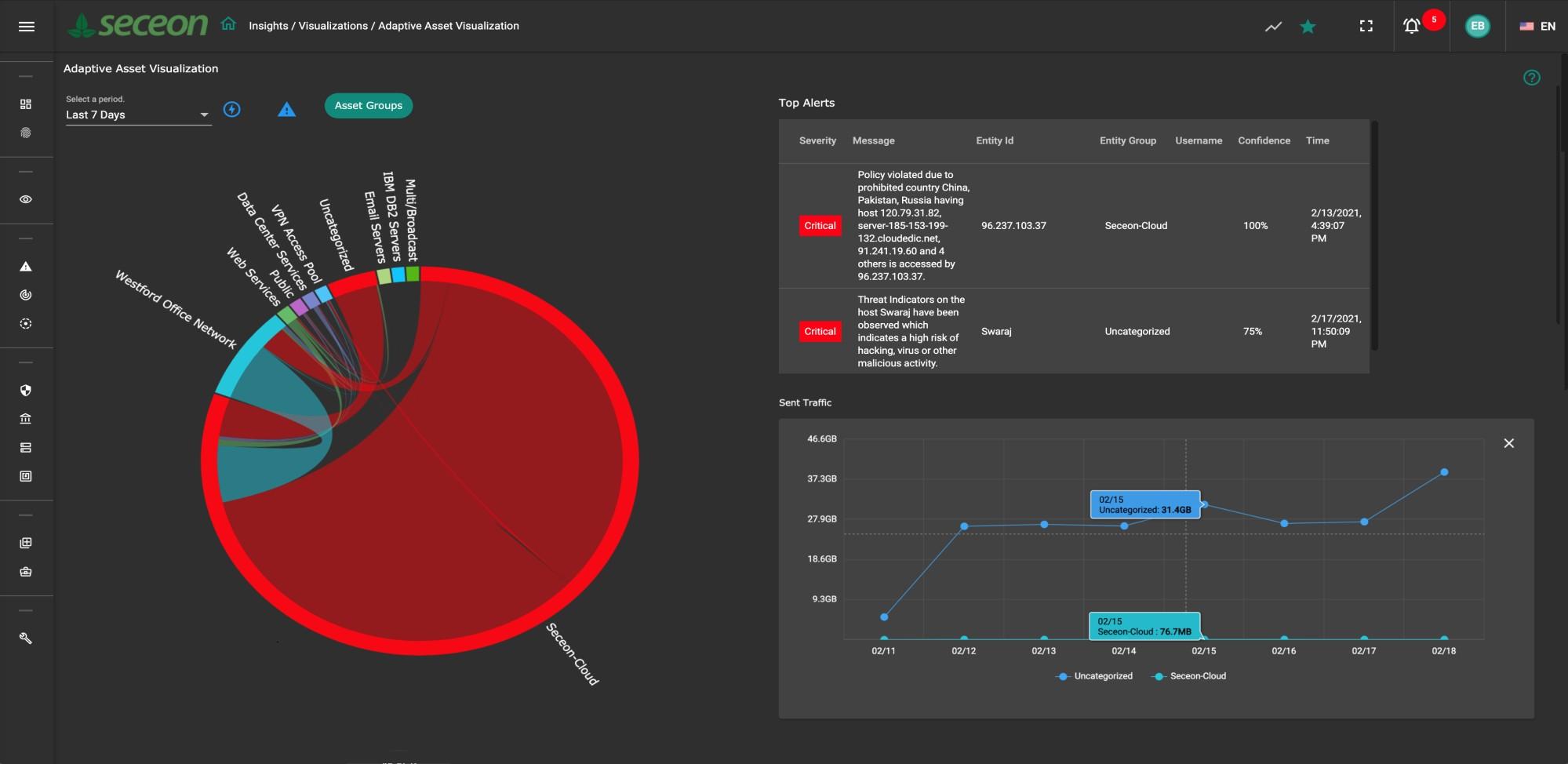 Get a quick view of network traffic among your asset categories and public URLs over a period of time showing amount of data, application type, number of bytes, flows etc.