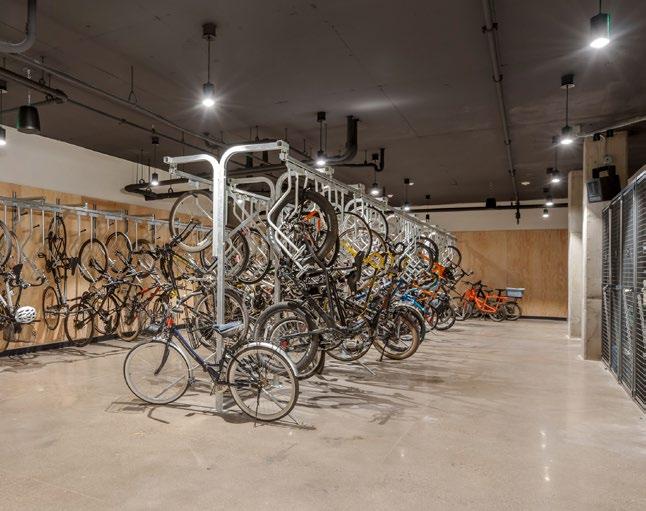 Residents enjoy a lounge, fitness center, electric bike charging stations, and gas fire pits