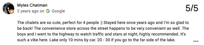 The chalets are each equipped with a full kitchen, full bath, queen bedroom, loft, living room, dining room, private covered deck with gas BBQ and patio with picnic table. They also feature Renaii hot water systems for heating and “On Demand” continuous hot water.