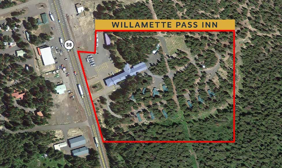 Nestled amidst the Cascade Mountains, the Willamette Pass Inn is a boutique hotel located in Crescent along Highway 58, a major mountain highway bridging Eugene to Highway 97. Spanning 12.27 acres (534,481 SF) across two parcels, the property is one of only a few resorts in Oregon that are not on leased forest service land.