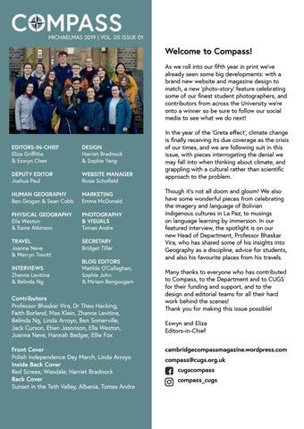 In the year of the ‘Greta effect’, climate change is finally receiving its due coverage as the crisis of our times, and we are following suit in this issue, with pieces interrogating the denial we may fall into when thinking about climate, and grappling with a cultural rather than scientific approach to the problem. Though it’s not all doom and gloom! We also have some wonderful pieces from celebrating the imagery and language of Bolivian indigenous cultures in La Paz; to musings on language learning by immersion. In our featured interview, the spotlight is on our new Head of Department, Professor Bhaskar Vira, who has shared some of his insights into Geography as a discipline, advice for students, and also his favourite places from his travels. Many thanks to everyone who has contributed to Compass, to the Department and to CUGS for their funding and support, and to the design and editorial teams for all their hard work behind the scenes! Thank you for making this issue possible! Eswyn and Eliza Editors-in-Chief cambridgecompassmagazine.wordpress.com compass@cugs.org.uk cugscompass compass_cugs