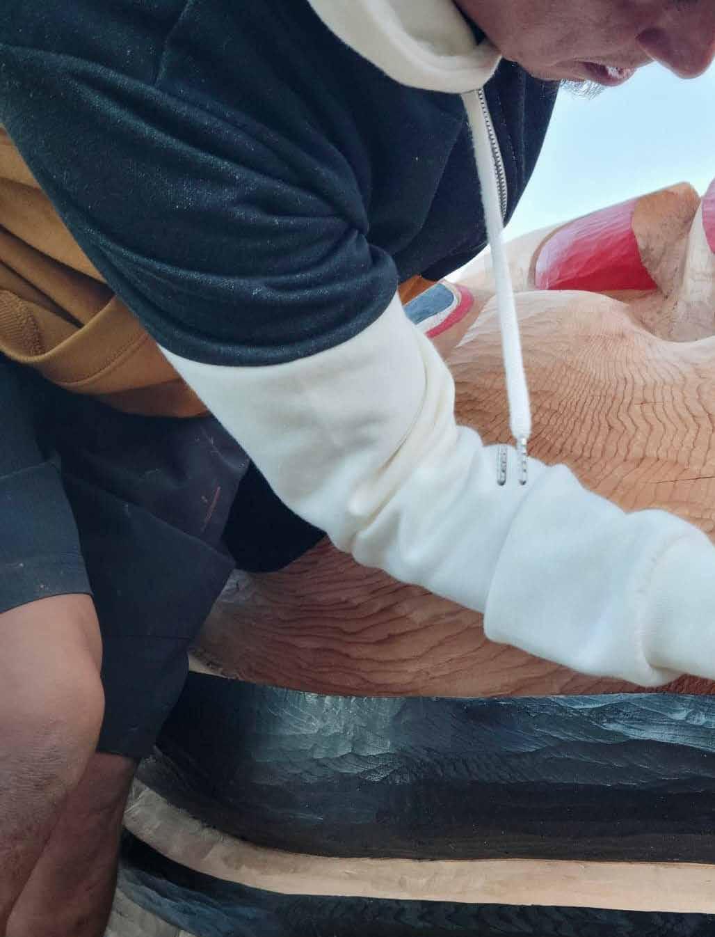 The project started in August and was complete early September of 2022 – 27 days total – till the raising of the pole in Squirrel Cove, in front of the Klahoose Nation Administration Office. This pole marks the first pole to be carved and raised since contact with historic adventurers. Many members gathered to honour the raising including some of Puglas’ closest family, Jonathan and Junior Henderson, his brother Andrew Puglas, his Mom and Dad and his son Hunter – they were surrounded by family and friends, including the Hanson’s. It was a great honour – they danced, sang and blessed the pole for Klahoose. He had been adopted into the Klahoose Nation, via Steph’s family. Being from Weiwaikum (Campbell River) as a Kwagiulth man and marrying a Salish woman – they feel the pole project was a binding of the marriage while honouring the Klahoose Nation. The pole will be in place till the end of its time. More opportunities are arriving now to teach and deliver more cultural projects for Klahoose.