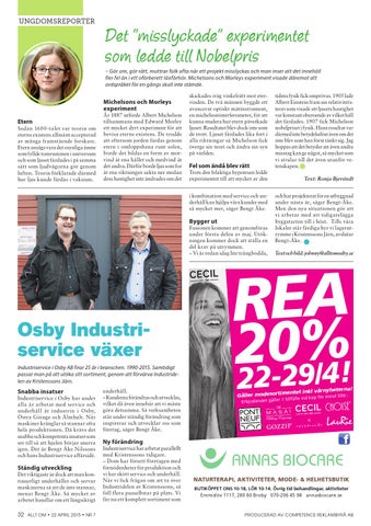 tidens fysik fick omprövas. 1905 lade Albert Einstein fram sin relativitetsteori som visade att ljusets hastighet var konstant oberoende av vilket håll det färdades. 1907 fick Michelson nobelpriset i fysik. Hans resultat var därmed inte betydelselöst även om det inte blev som han först tänkt sig. Jag hoppas att det betyder att även andra misstag kan ge något, så mycket som vi strular till det även utanför vetenskapen. Text: Ronja Bjerstedt och har projekterat för en utbyggnad under nästa år, säger Bengt-Åke. Men den nya situationen gör att vi arbetar med att tidigarelägga byggstarten till i höst. Tills våra lokaler står färdiga hyr vi lagerutrymme i Kristenssons Järn, avslutar Bengt-Åke. Text och bild: johnny@alltomosby.se
