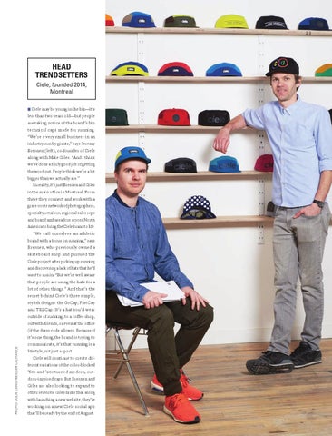 Ciele, founded 2014, Montreal Ciele may be young in the biz—it’s less than two years old—but people are taking notice of the brand’s hip technical caps made for running. “We’re a very small business in an industry run by giants,” says Jeremy Bresnen (left), co-founder of Ciele along with Mike Giles. “And I think we’ve done a fairly good job of getting the word out. People think we’re a lot bigger than we actually are.” In reality, it’s just Bresnen and Giles in the main office in Montreal. From there they connect and work with a grass-roots network of photographers, specialty retailers, regional sales reps and brand ambassadors across North America to bring the Ciele brand to life. “We call ourselves an athletic brand with a focus on running,” says Bresnen, who previously owned a skateboard shop and pursued the Ciele project after picking up running and discovering a lack of hats that he’d want to run in. “But we’re well aware that people are using the hats for a lot of other things.” And that’s the secret behind Ciele’s three simple, stylish designs: the GoCap, FastCap and TRLCap. It’s a hat you’d wear outside of running, to a coffee shop, out with friends, or even at the office (if the dress code allows). Because if it’s one thing the brand is trying to communicate, it’s that running is a lifestyle, not just a sport. Ciele will continue to create different variations of the color-blocked ’80s and ’90s turned modern, outdoor-inspired caps. But Bresnen and Giles are also looking to expand to other services. Giles hints that along with launching a new website, they’re working on a new Ciele social app that’ll be ready by the end of August.