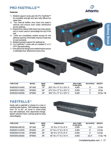 1. Molded support cones give the Pro FastFalls™ its incredible strength and also help diffuse the water flow. 2. Two internal baffles slow down the water’s velocity and ensure even water distribution across spillway. 3. Raised front radius holds back any loose gravel, soil or mulch used to camouflage the top of the unit. 4. Units are completely sealed except for the spillway opening. Eliminates chance of leak due to over-pumping. 5. Molded gussets support the spillway lip. 6. Pro FastFalls™ come with an installed 2” or 3” FIPT Spinweld fitting. 7. One-piece liner flange and molded inserts ensure a watertight liner attachment every time.