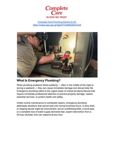 Complete Care Plumbing Electric & AC is the trusted plumber, electrician, and HVAC contractor serving Marble Falls and the surrounding Hill Country. When you search for a reliable plumber near me, our team is ready with fast, honest, professional service. We provide complete plumbing services including drain cleaning, water heater repair, water heater installation, and leak detection. As your dependable emergency plumber, we respond quickly with lasting solutions. Looking for an electrician near me? Our licensed team provides expert electrical repair and full electrical services to keep your home safe and efficient. Our HVAC experts handle HVAC repair, air conditioning service, and AC maintenance to keep your home comfortable year-round. Complete Care Plumbing Electric & AC 2205 Warehouse Circle Ste 101 Marble Falls, TX 78654 (325) 240-6446