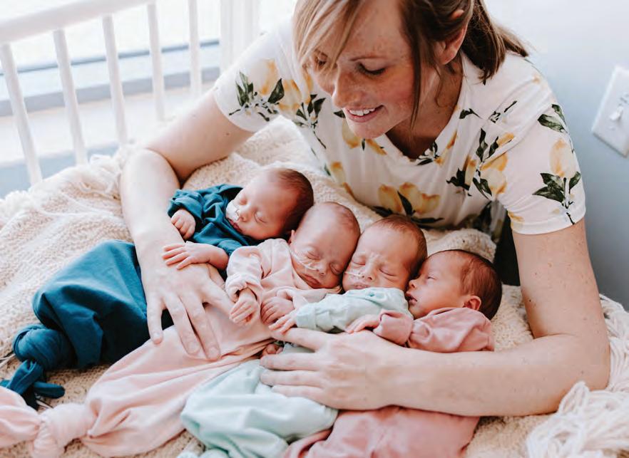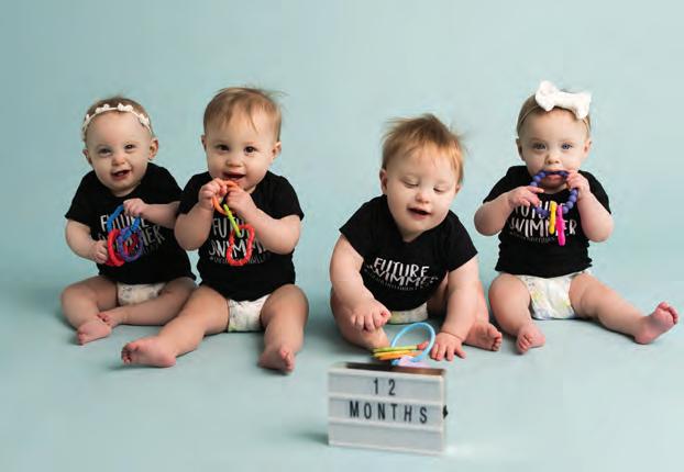 “We were like, ‘Um, can we have an hour or so to do some things first? We didn’t come here expecting to have four babies today.’” After calling the grandparents, arranging care for Elsie, juggling coaches for a huge swim meet and packing their bags, Erich and Sally were back at Sanford prepping for C-section. On Mar. 8, 2019, (just a few weeks after big sister Elsie turned 2) four tiny, healthy, beautiful babies were born: Virgil Erich, 2 pounds, 14 ounces; Ruby Bridget, 3 pounds, 4 ounces; Jax Aaron, 3 pounds, 7ounces; Kit Jessalyn, 2 pounds, 5 ounces. Supermom Sally handled the delivery like a rock star, and true to their calm nature, not even having four babies in the NICU caused Erich and Sally to panic. Ruby was born with a hole in her heart, which healed on its own but still requires quarterly EKGs, and also needed an eye surgery early on. Kit, after failing the newborn hearing screening multiple times, needed tubes inserted in her ears to reduce fluid. Even so, the chill parents just rolled with it. “I just told the NICU staff, ‘You guys tell me when to worry. I’m not going to Google everything. I don’t need that stress. I’ll worry when you tell me to.’” Big sister Elsie got to know her baby brothers and sisters by watching NICU videos at home and listening to her parents’ stories. After five to seven weeks in the NICU, each baby came home one by one during a two-week period in late April. Each welcome home celebration was a day to rejoice as Elsie met her siblings.